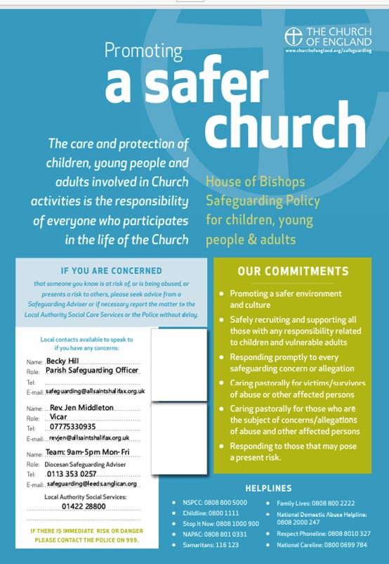 All Saints’ Halifax has adopted The Church of England Safeguarding Policy: Promoting a Safer Church – Click here to view or download